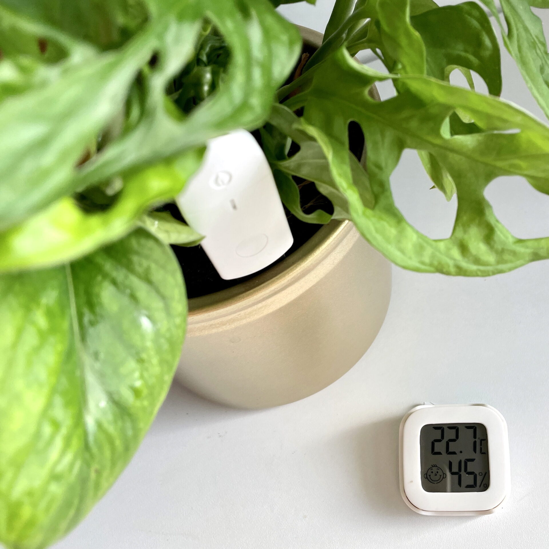 De hygrometer is het kleine vierkante apparaatje, 45 x 45 x 13 mm. Deze laat je zien hoe hoog de luchtvochtigheid is en wat de precieze temperatuur rondom je planten is. Zo kan je in een oogopslag zien hoe blij jouw planten zijn: